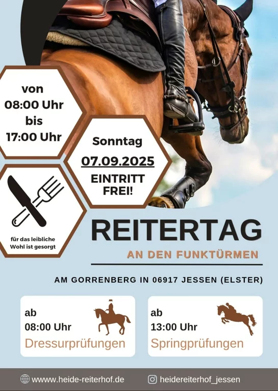 Der Höhepunkt ist unser alljährlicher Reitertag im September. Zahlreiche Reiter und Reiterinnen aus der Region messen sich dann in Spring- und Dressurprüfungen bis Klasse A.